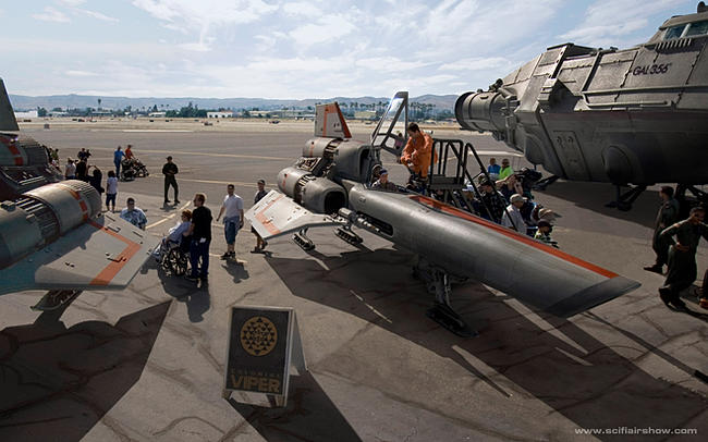 TIE Fighter (From Star Wars) Vipers (from Battlestar Galactica): OK: Here's the catch: None of this is real. It's fantastically skillful Photoshopping using photos of props and scale models inserted into images from real air shows. The Sci-Fi Airshow exists only as a website! Click for more ships, more pix, more info: http://www.scifiairshow.com/ |